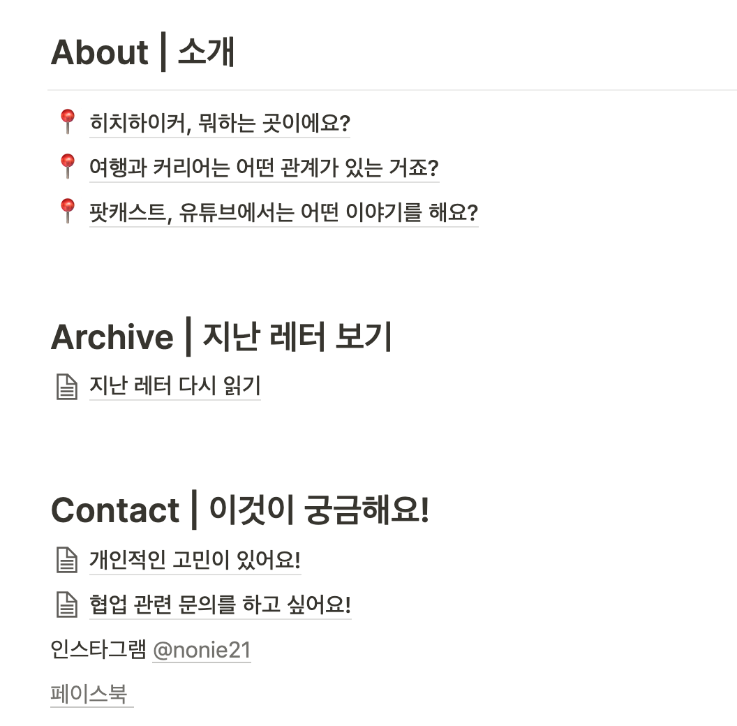 뉴스레터 홈페이지에서는 히치하이커의 소개, 그리고 팟캐스트와 유튜브에서는 어떤 이야기를 하고 있는지 소개했습니다.