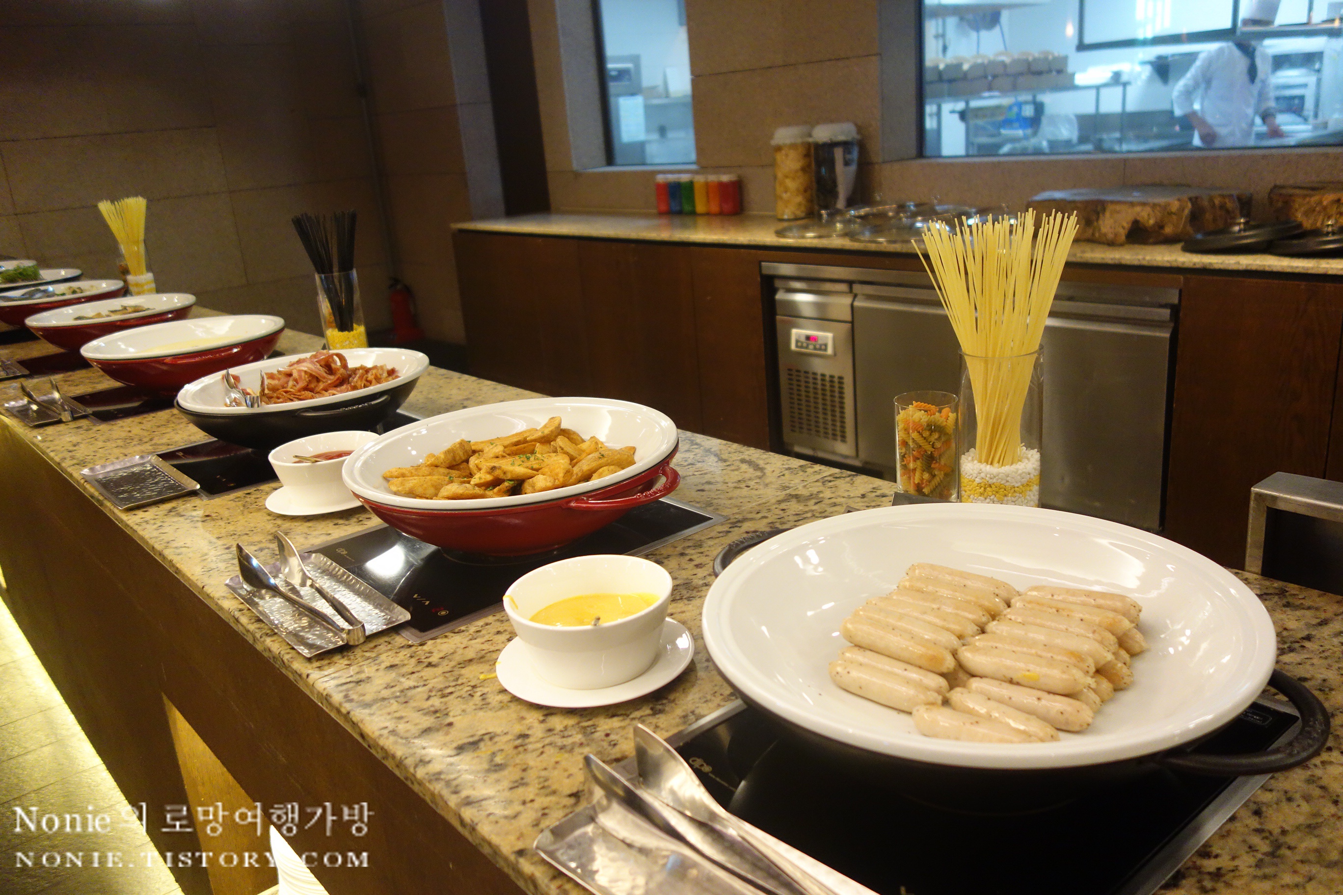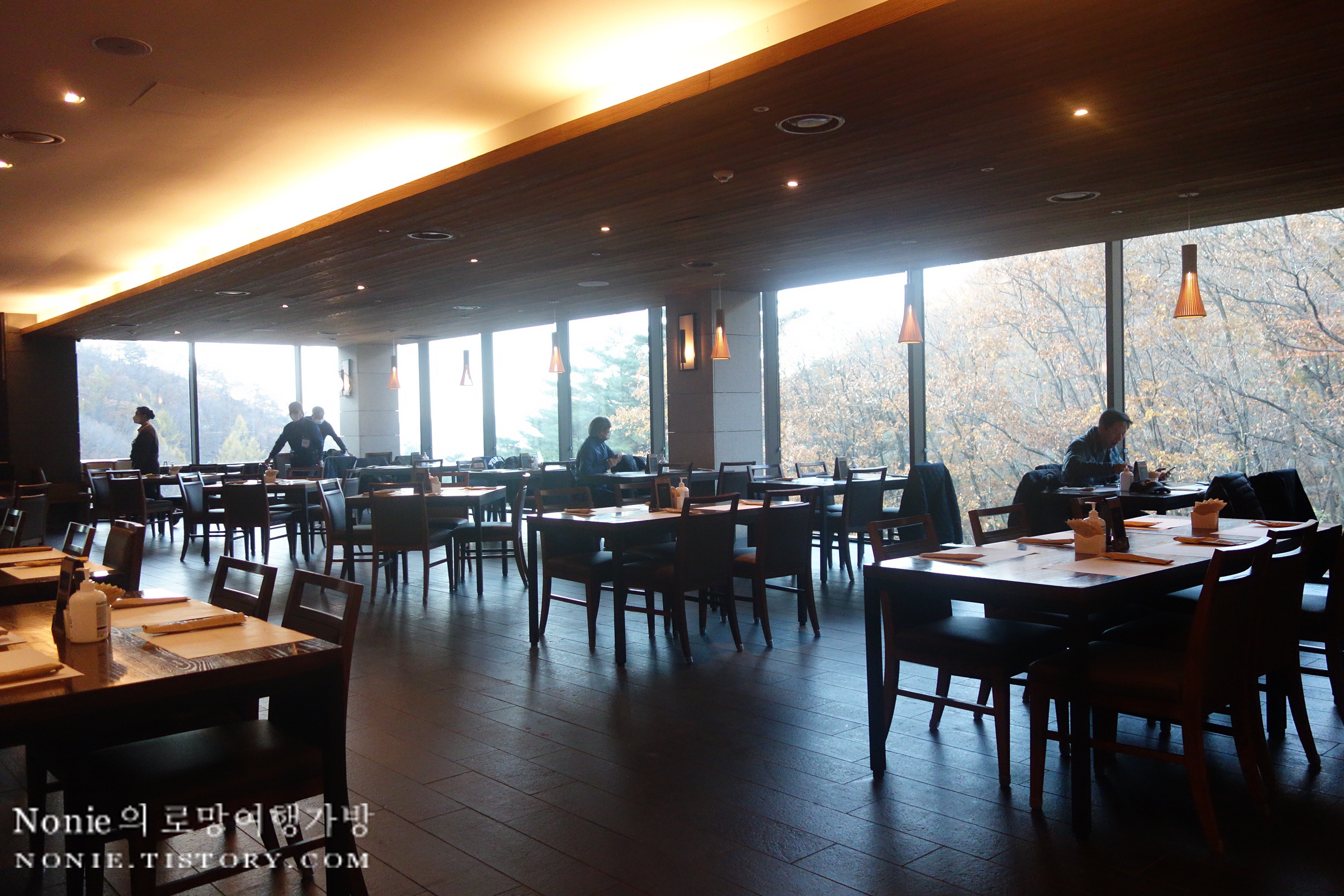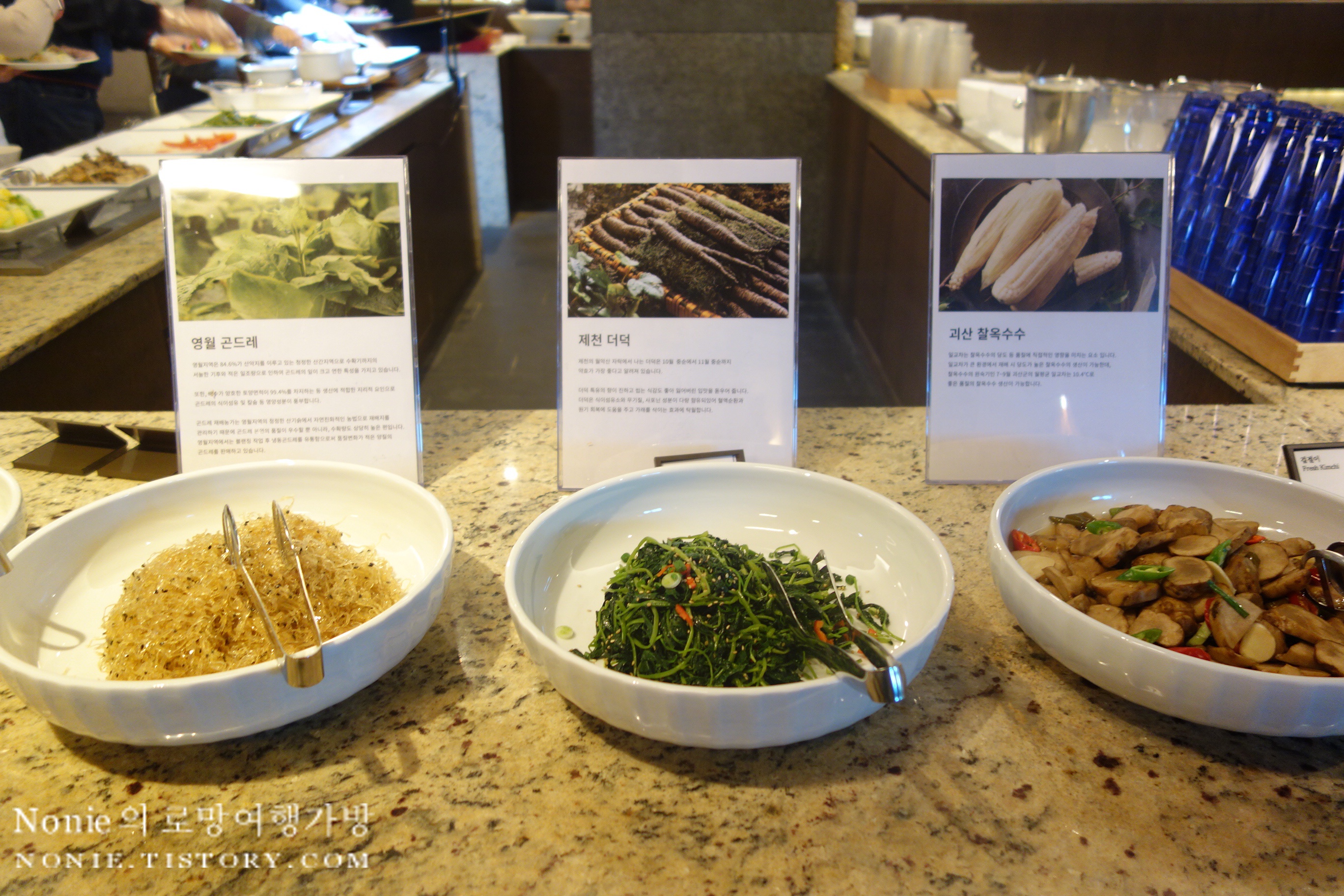 뷔페 구성은 일반적인 풀 뷔페여서, 푸짐하게 먹자면 얼마든지 푸짐하게 먹을 수 있다. 양식, 한식은 물론 쌀국수와 오믈렛 쿠킹 섹션도 있고 와플 섹션도 있다. 특히 눈에 띄는 건 샐러드 바가 잘 구성되어 있고 채소는 산지 위주여서 맛이 뛰어나다. 다른 데서는 잘 안먹는 샐러드인데, 여기서는 구운 버섯 샐러드를 두 번이나 가져다 먹었다. 그리고 뒤에도 얘기하겠지만 제천은 한방의 고장이다. 그래서 타 호텔 뷔페에 비해 전통 차(tea)의 종류가 좀더 풍부했다. 나는 커피 외에 목에 좋다는 모과차를 한 잔 마셨다.
