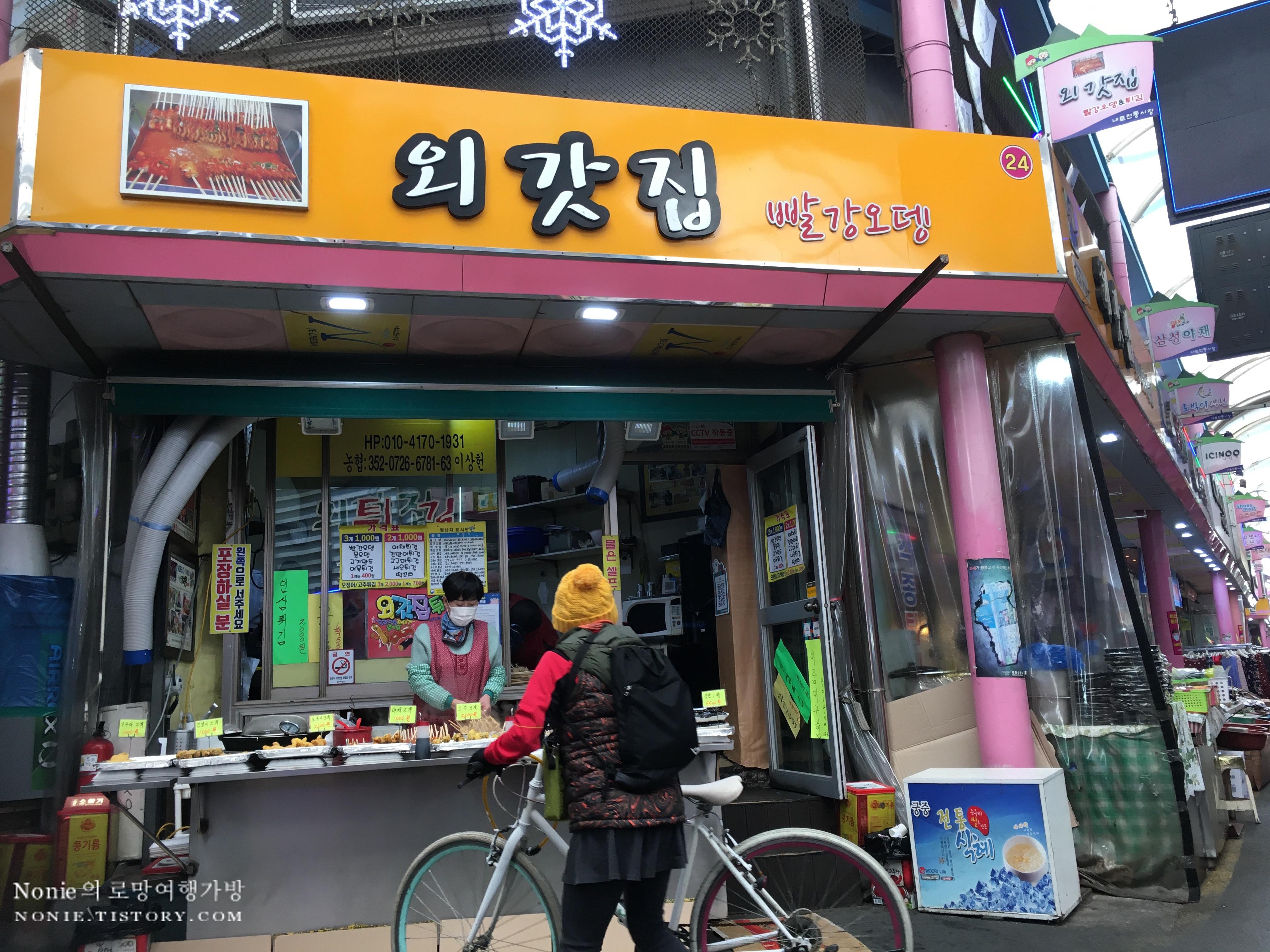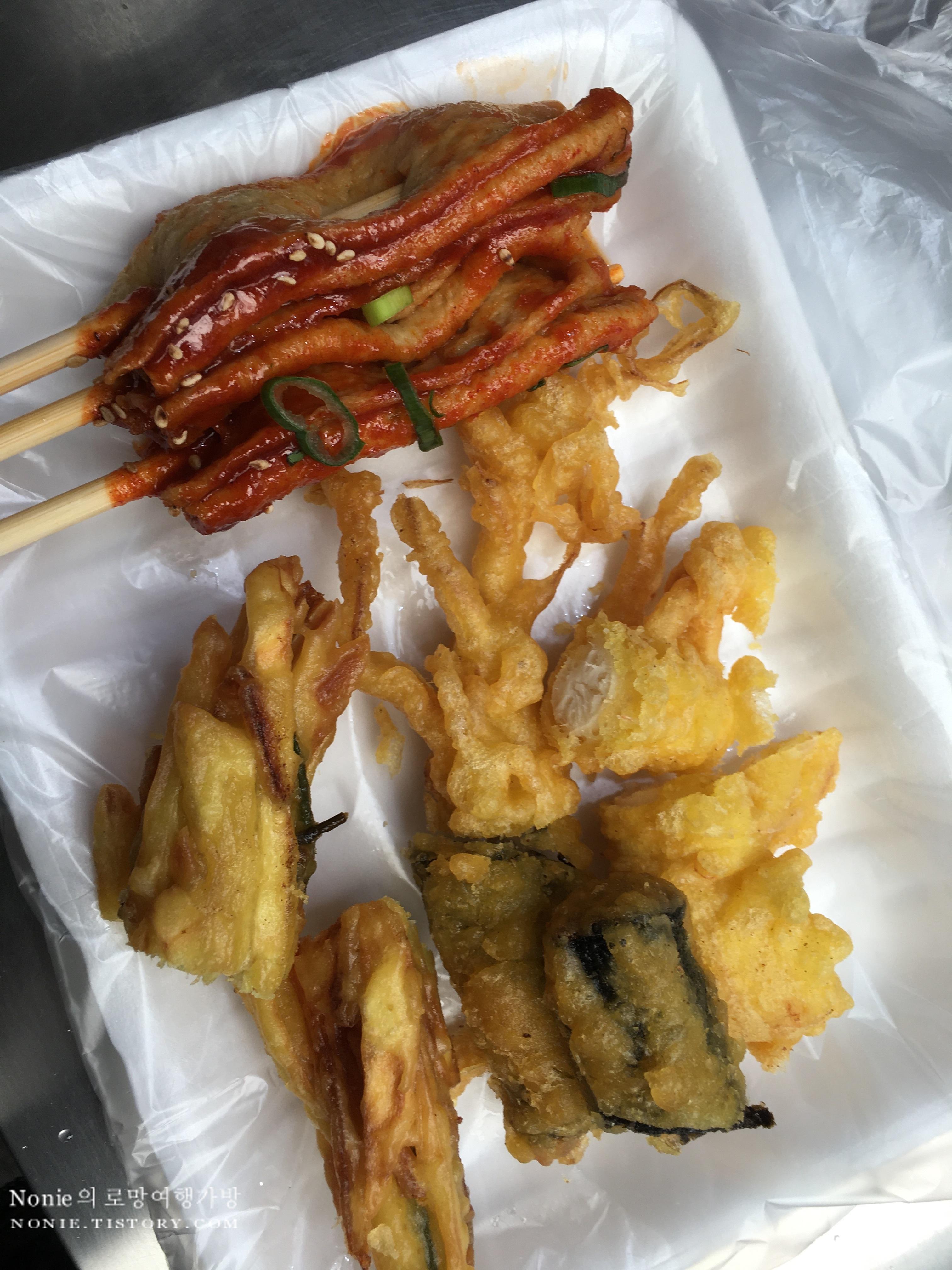 강의가 끝나고 가벼운 마음으로 택시를 타고 시내로 향했다. 아직 점심시간이니 간단히 시장에서 끼니를 해결하고 장을 볼 참이다. 제천 시내에는 여러 전통시장이 모여 있는데, 그 중에서 빨간 오뎅집이 모여 있는 내토 전통시장의 맛집 '외갓집'에서 빨간 오뎅과 인삼 튀김, 모듬 튀김을 시켜 맛을 보았다. 가장 놀랐던 건 인삼 튀김인데, 인삼 맛이 확 날것 같은 생각과는 달리 버터처럼 부드러운 속살과 향기로운 맛이 일품이다. 요 외갓집 바로 옆에 부각을 파는 집이 있는데, 거기서 한 봉지에 3000원씩 사온 김 부각도 정말 맛있게 먹었다. 다음에는 여러 부각을 이것저것 사와서 먹어봐야겠다.