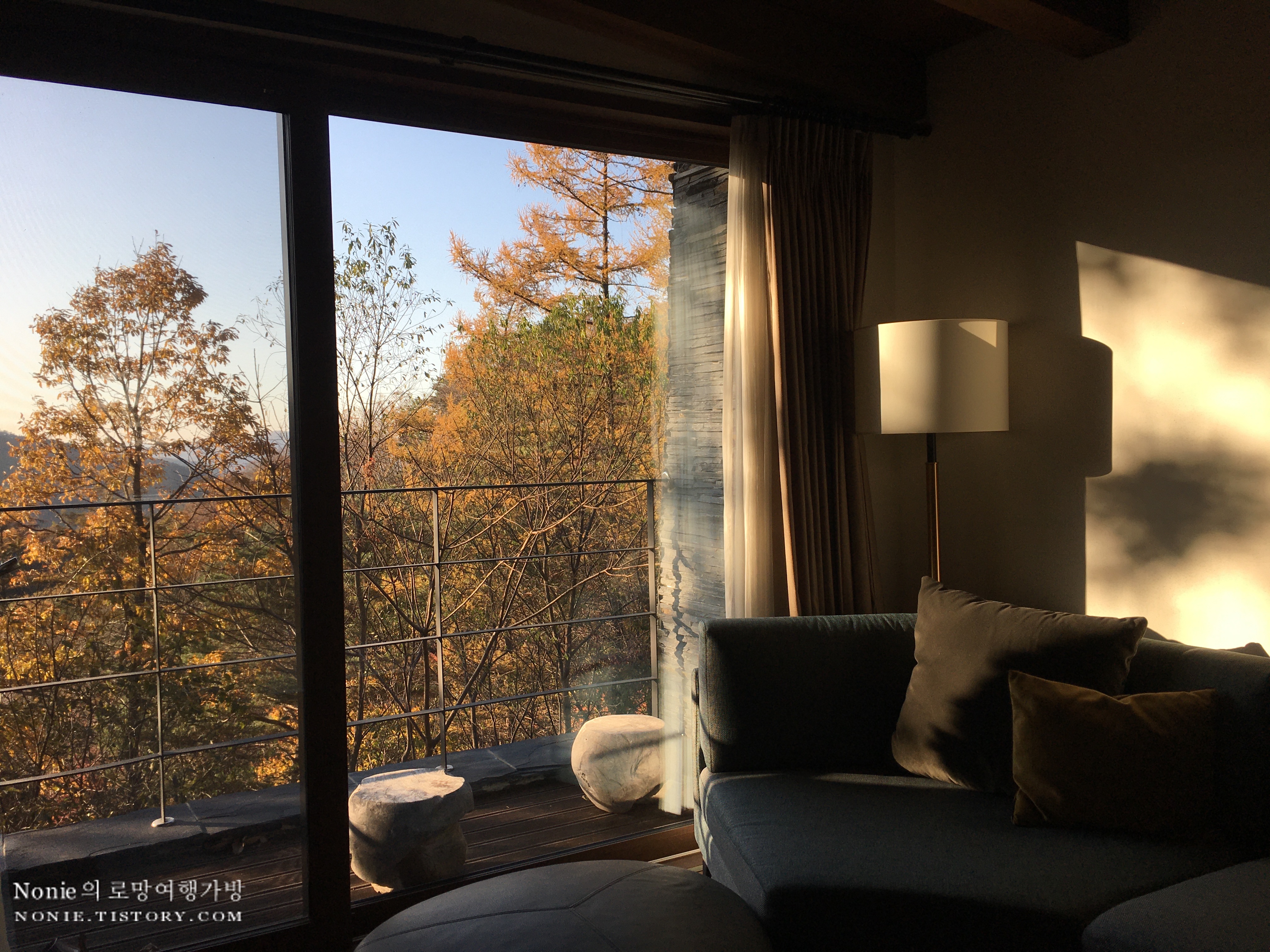 해가 짧은 계절, 그리고 경관이 좋은 숙소에서 묵을 때는 평소보다 조금 일찍 일어난다. 산속의 밤은 길고, 아침은 소중하다. 역시나 거실에 비쳐드는 아침의 그림자가 고요해서, 그냥 머무는 것 자체가 쉼을 주는 시간이다. 일본에선 "나무의 잔가지에서 햇살이 새어 나와 무늬처럼 빛과 그림자가 떨어지는 광경"을 가리키는 木洩れ日(코모레비)라는 단어까지 있다. 그냥 햇살이라고 뭉뚱그리기엔, 너무나 특별한 아름다움이기는 하다.