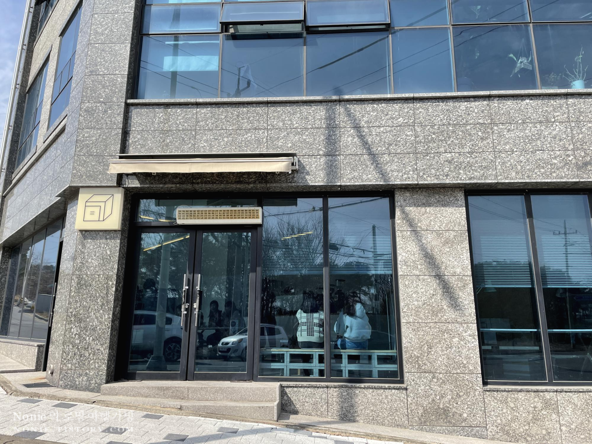 카페에 간다더니 왠 건물 앞을 가리키며 '여기에요'라는 말에 건물을 자세히 들여다 봤다. 상호명도 없이 박스 모양 로고만 새겨진 간판, 그리고 통유리창 너머로 사람들이 꽉찬 놀라운 광경이 눈에 띄었다. 여기가 카페라고?