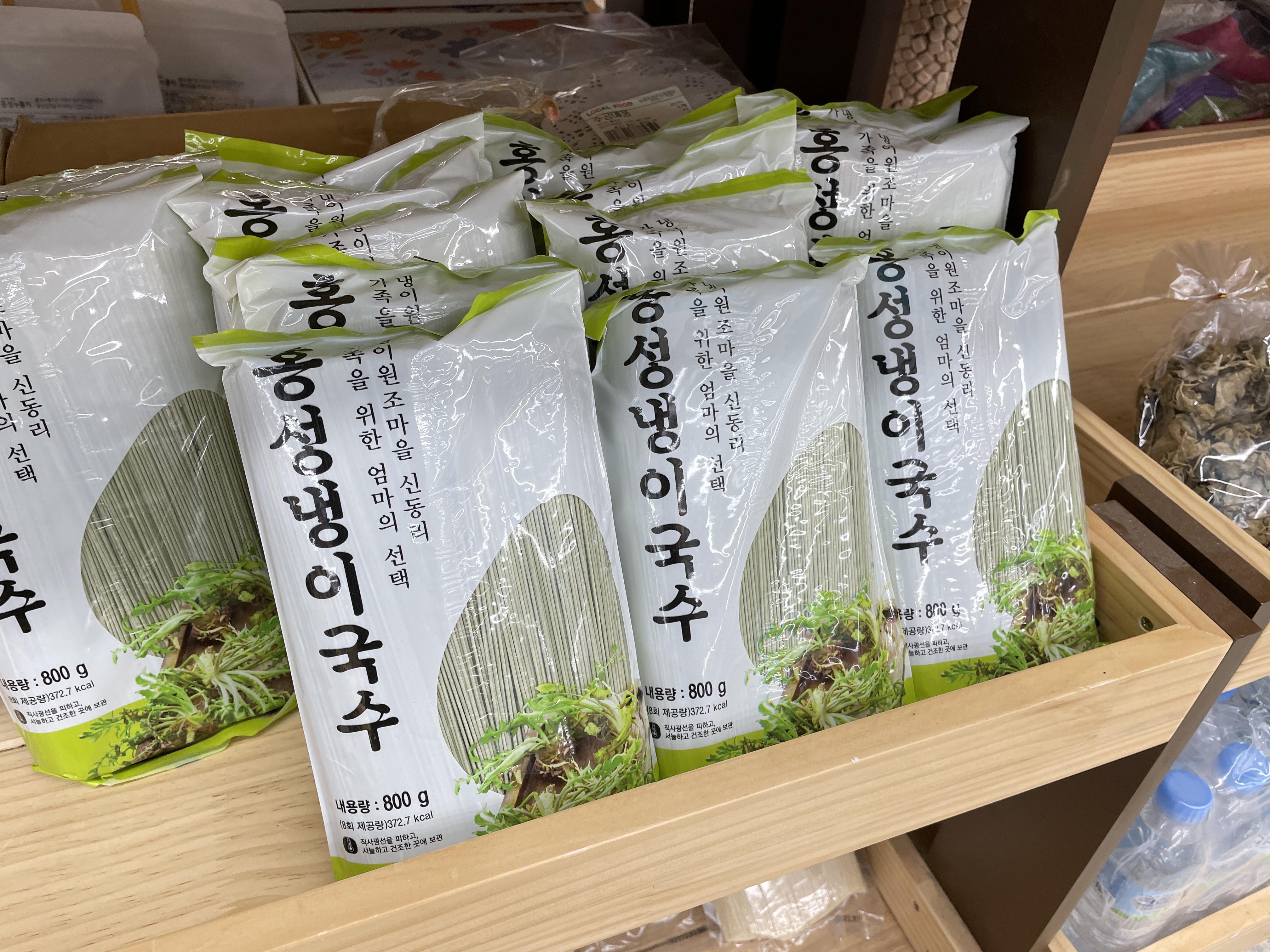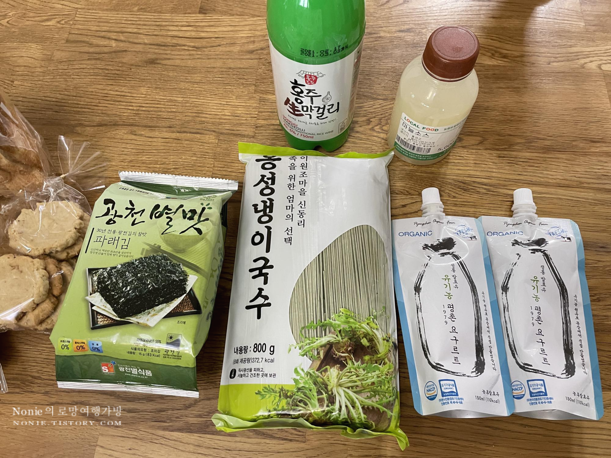 국수 코너에서 '홍성 냉이국수'라는 신박한 로컬 아이템을 발견해서 주워담고, 막걸리는 지역 막걸리가 서너 가지 있었는데 가장 진한 맛과 향을 가졌다는 홍주 생막걸리를 선택했다. 홍성 하면 광천 김인데, 서울의 대형 마트에서는 찾아볼 수 없는 광천의 지역 김이 진짜 많았다. 로컬 식재료 좋아한다는 말에 화영 님이 감사하게도 한 박스를 들려주셔서 감동...ㅜ.ㅜ