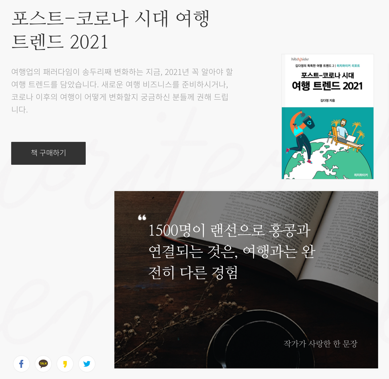 특히 책 <여행의 미래> 출간 이후 다루지 못했던, 코로나 시대의 새로운 여행 트렌드를 테마 별로 나누어 소개했습니다. 책에 대한 자세한 소개는 지난 포스트를 참고하시면 됩니다.