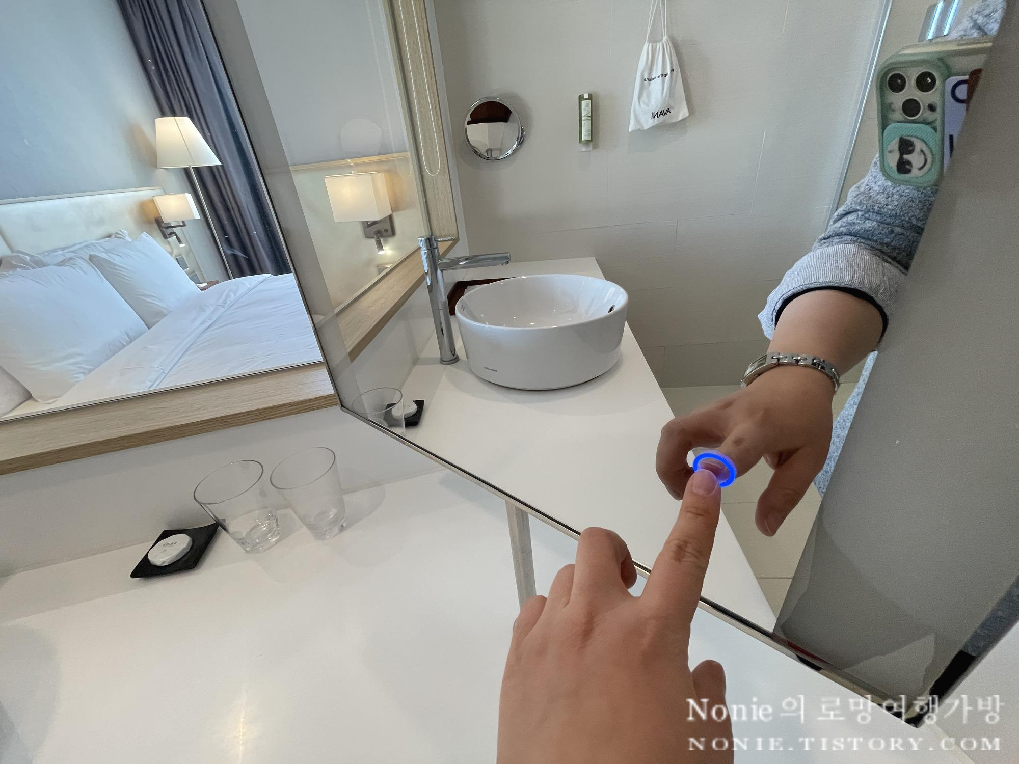 욕실에서 특이할 점은 거울인데, 거울이 여러 방향으로 회전이 되는데다 불을 켜면 엄청 밝은 조명으로도 기능한다. 이것은 호텔이 '인증샷, 사진 촬영 공간'으로 기능하는 최근의 트렌드를 잘 반영한 시설로 보인다.