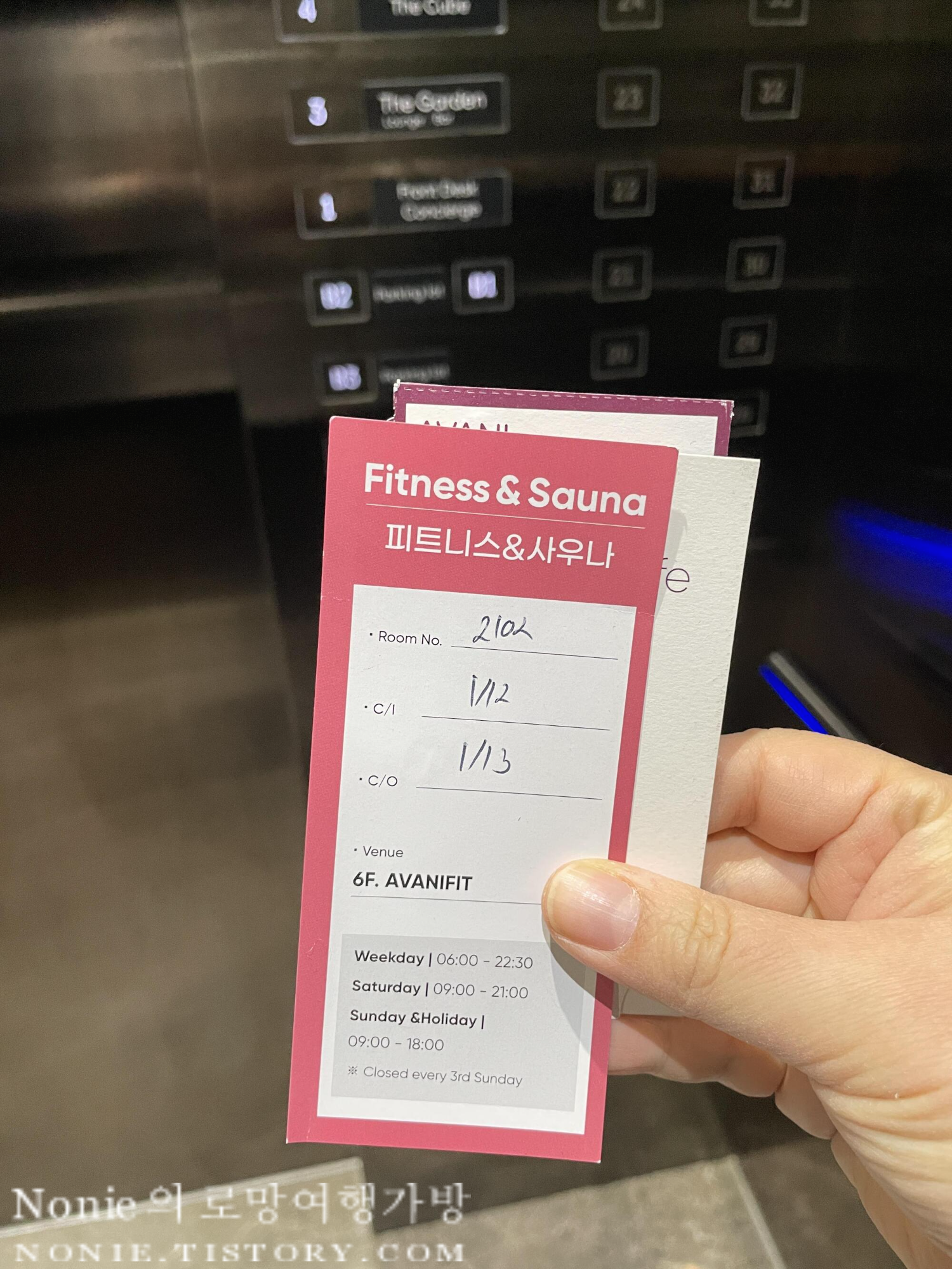 추운 겨울에 거리를 걷다 보니 금새 피곤해져서, 서면에서 마을버스를 타고 호텔로 돌아왔다. 체크인 때 받았던 사우나 쿠폰을 사용하러 6층 피트니스로 향했다.