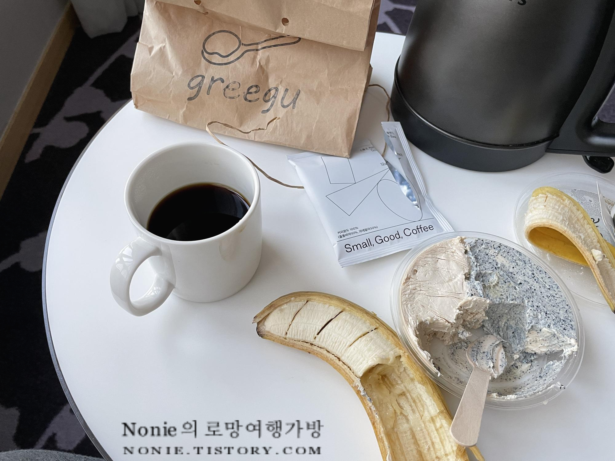 조식은 포함되어 있지 않은 투숙이어서, 전포의 '그리구 요거트'(호텔에서 도보 15분 거리)에서 사다 놓았던 두유 요거트와 1층 편의점에서 사온 바나나 등으로 조촐하게 아침을 해결했다. 수제 요거트 집에서 판매 중인 두유 요거트는 그릭 스타일이라 수분감이 거의 없는 요거트다. 2가지 맛 선택해 250g에 1만원 선으로 꽤나 가격대가 있는데다, 너무 뻑뻑해서 혼자 한 통을 다 먹는게 다소 버겁기도 했다. 이번 부산 여행에서 나름대로 잡았던 테마가 '채식'이기도 했는데, 여행 중에 삼시 세끼를 채식만 찾아다니고 준비하는 게 쉽지만은 않다는 걸 새삼 느낀다.