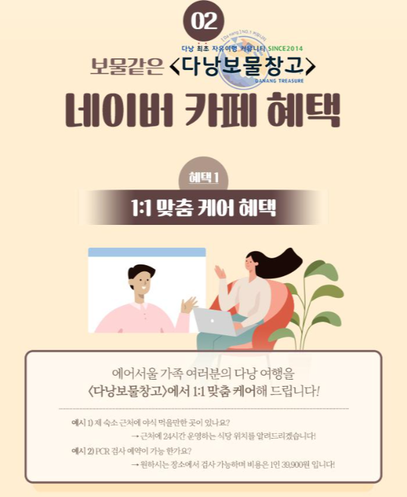 그런데 취항 특가를 내놓으며 다낭과 나트랑 재취항을 알린 에어서울의 뉴스레터에, 눈에 띄는 대목이 있습니다. 항공권을 구매하고 나면 숙소나 할거리 볼거리를 찾는게 자유여행 예약의 순서죠. 그런데 항공사가 네이버의 다낭 카페인 다낭보물창고와 제휴를 맺고 에어서울 항공권을 예약하면 해당 카페에서 1:1 맞춤 케어를 해준다는 안내를 올렸습니다. 맞춤 케어의 범위가 어디까지인지 정확히 알 수는 없지만, 예시로 나온 문답을 보면 숙소 근처의 맛집 추천, PCR 검사 예약 여부 등을 묻는 질문이 있습니다.