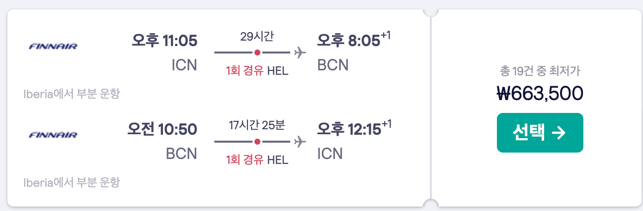 1월 15일 바르셀로나 ~ 1월 24일 헬싱키 ~ 1월 29일 인천 귀국편 77만원 항공권 자세히 보기(클릭)