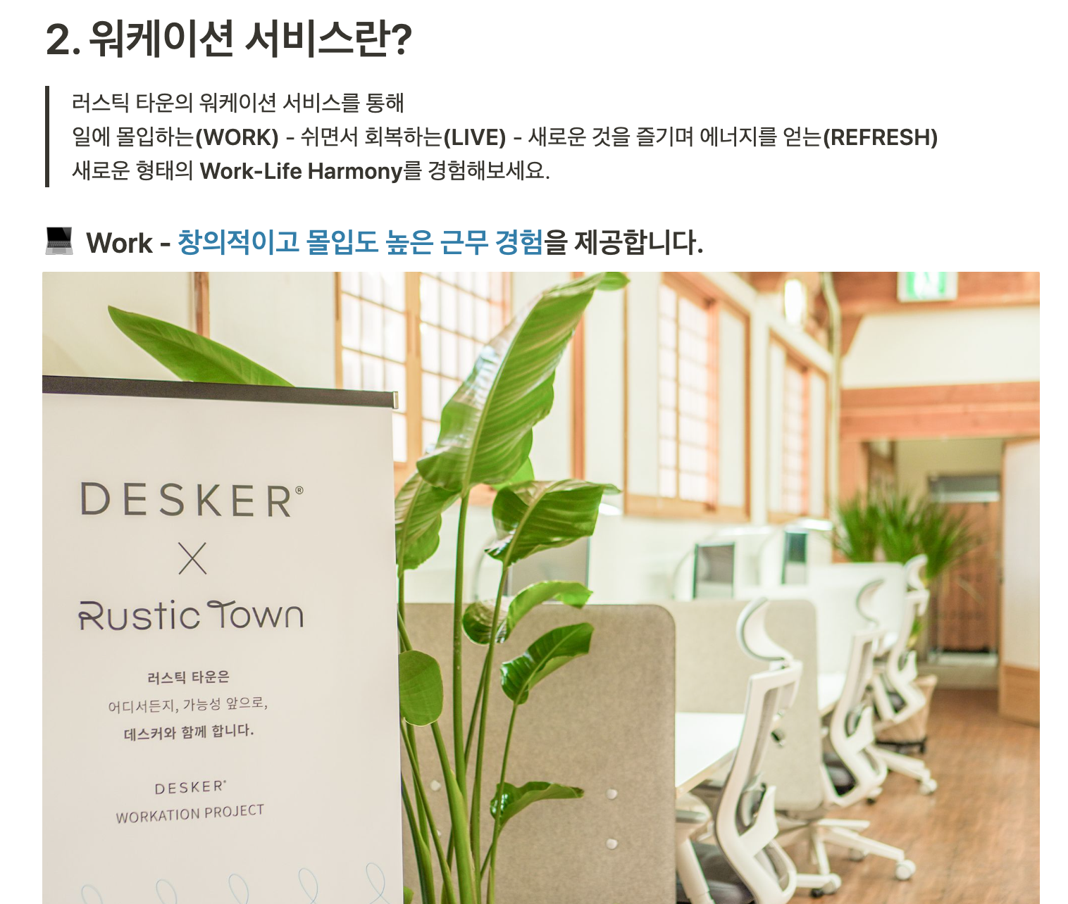 첫번째는 전남 곡성군에 있는 심청 한옥마을을 기반으로 지역 협동조합인 팜앤디에서 만든 워케이션 프로그램 '러스틱 타운'입니다. 이 러스틱 타운 프로그램은 2. 한옥/초가집 외관 + 깔끔한 현대식 내관 3. 1인실 또는 2인실 제공 4. 타운 외 이동을 위한 카셰어링 서비스 (카플랫) 5. 주변 맛집 추천 등으로 구성된 기업형 워케이션 상품입니다. 한옥마을에서 머물긴 하지만 데스커라는 오피스 전용 가구로 만들어진 코워킹 오피스가 완비되어 있어서 일하는 사람들에게 최적화된 근무환경을 조성했다는 뜻입니다. 이미 쿠팡, 토스뱅크, 카카오스타일, 네이버, 민병철교육그룹, 이노션 등 다양한 기업이 참여한 이력이 있다고 하네요.