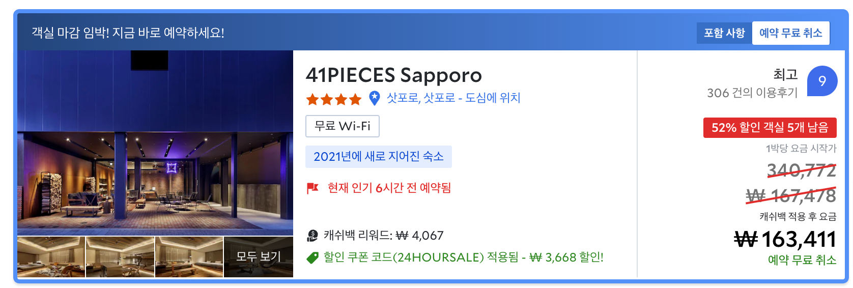 [삿포로 추천 숙소] 41피시스 삿포로 할인가로 예약하기 (바로 가기)