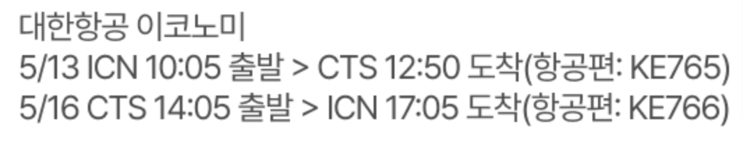 위 숙소가를 뽑아본 5/31~6/3일 일정에 맞춰 대한항공 3박 4일 삿포로행 왕복을 검색해보니 50만원이 나온다.(바로 가기)