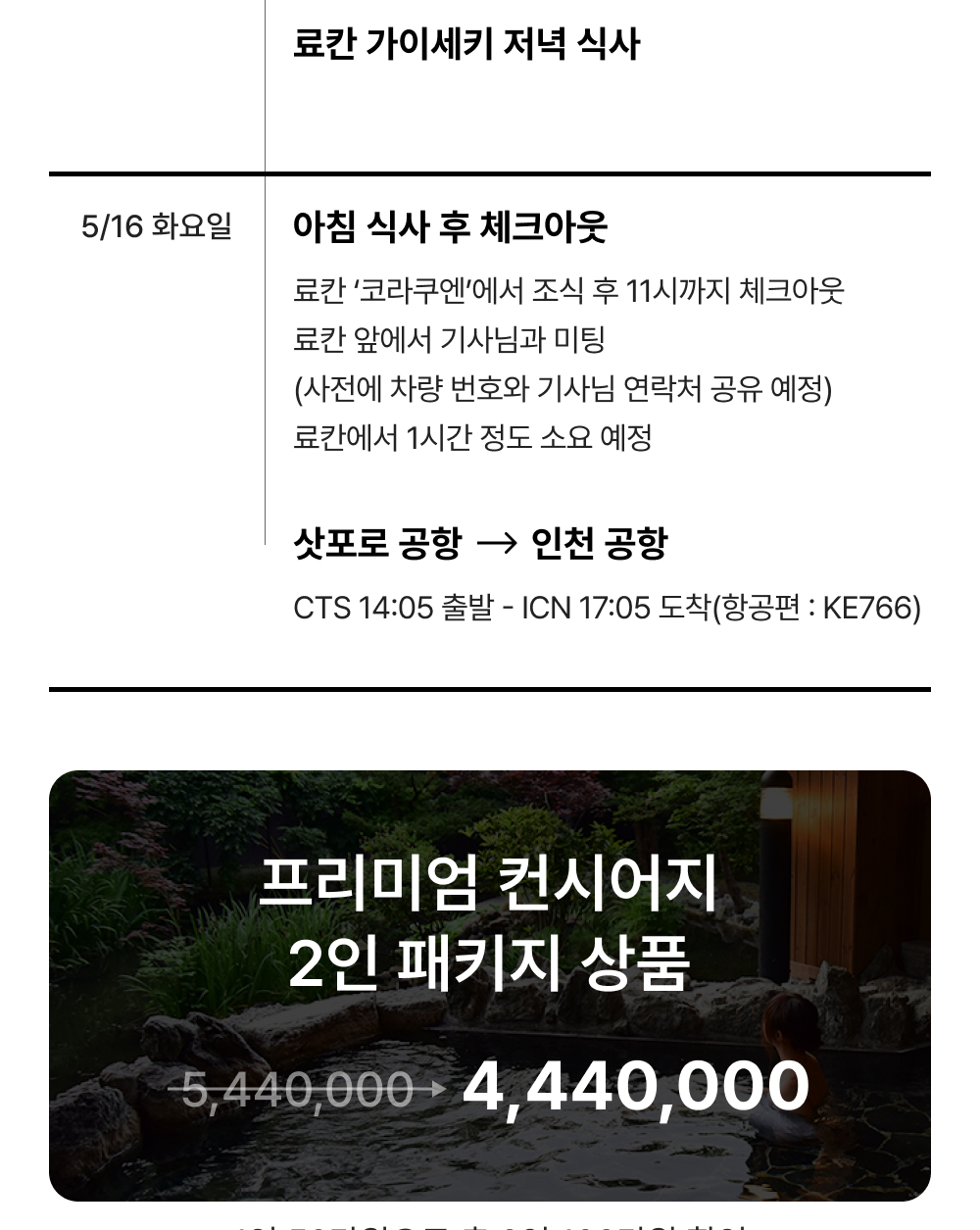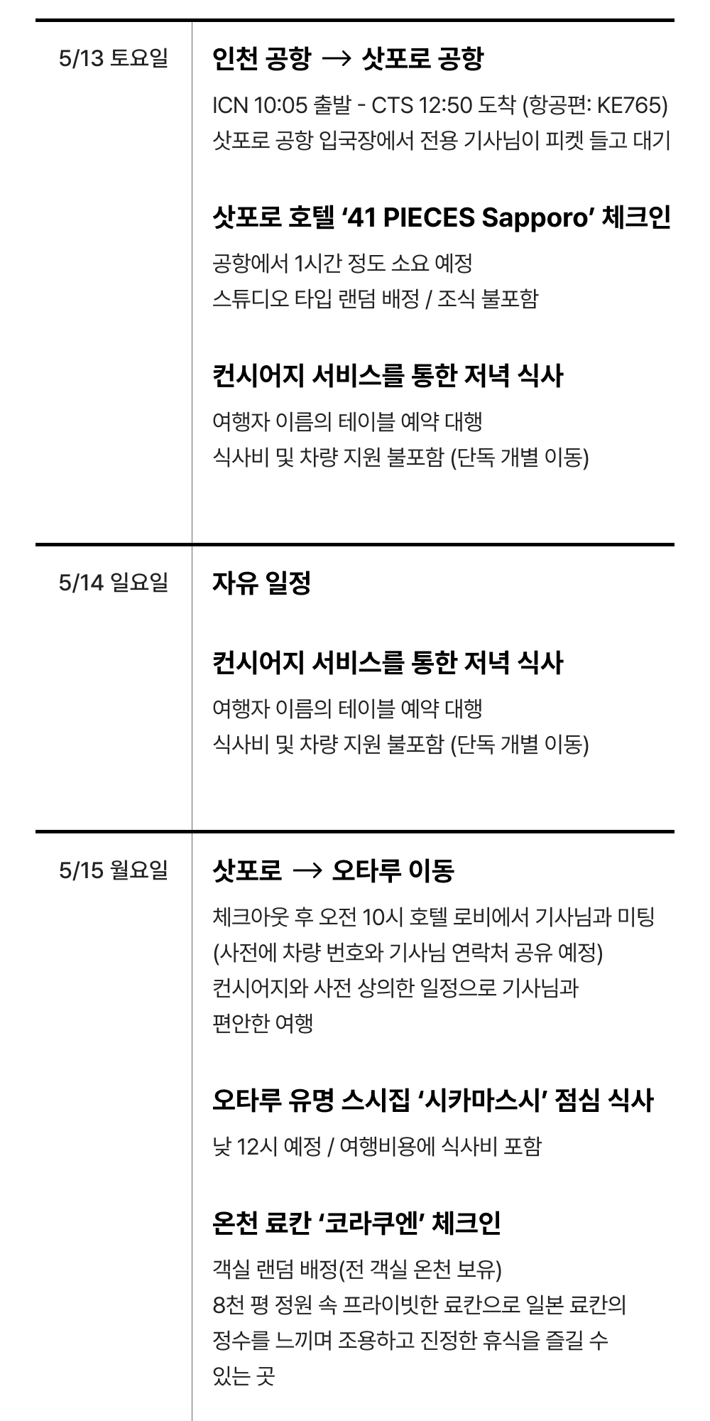 즉, 삿포로에서 2번의 미슐랭급 저녁식사를 하고 오타루에서 같은 초밥을 사먹는다 해도, 초호화 식비 예산은 50만원 선에서 스스로 설계할 수 있다. 그런데 이 444만원짜리 상품에는 식사 비용이 모두 빠져 있고 컨시어지(무료)만 해준다는 게 팩트다.