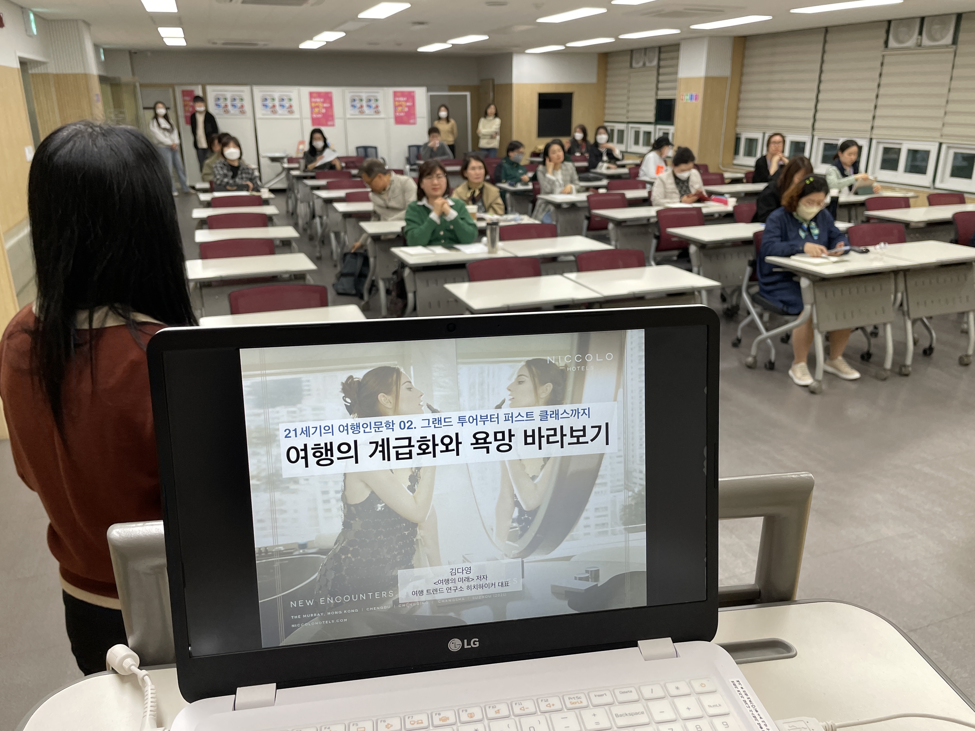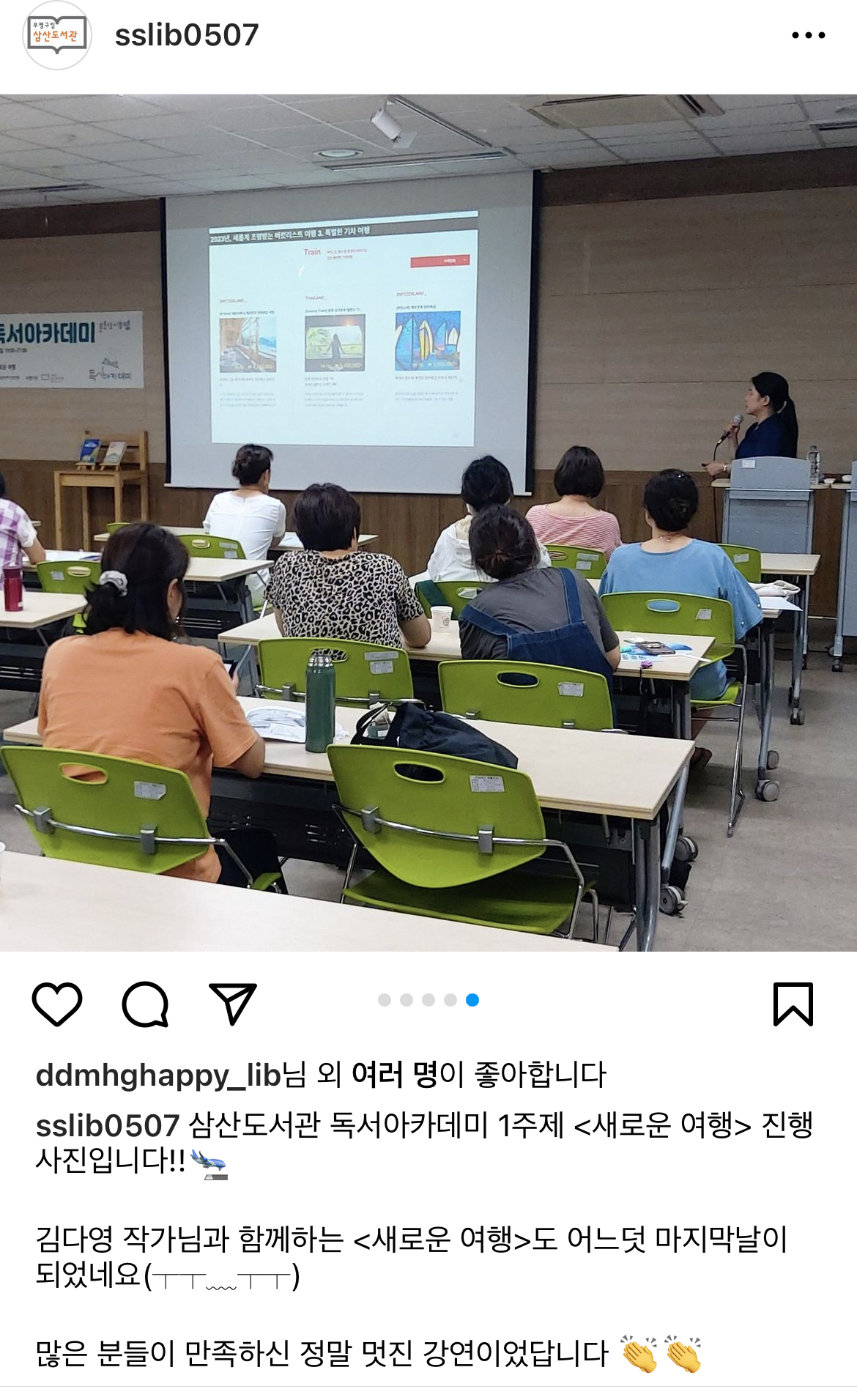 용답도서관에서는 5주간 여행 인문학 수업을 진행했습니다. 강의장에 제 저서인 '여행의 미래', '여행을 바꾸는 여행 트렌드'를 항상 비치해 두셔서, 많은 수강생 분들이 수업 오셔서 책을 읽어보시더라고요. 그리고 용답도서관에는 여행과 인문학에 대한 열정과 관심이 높으신 분들, 그리고 해외여행 경험치가 높은 분들이 많이 오셔서 깊이 있는 질문도 많이 주시고 호응도가 유독 좋았던 기억입니다. 크루즈 여행을 다루는 4주 수업 때는 크루즈 여행 경험이 많으신 수강생 분들의 에피소드도 함께 들어볼 수 있어서 재미있었고요. 여러 모로 즐거웠던 수업입니다.