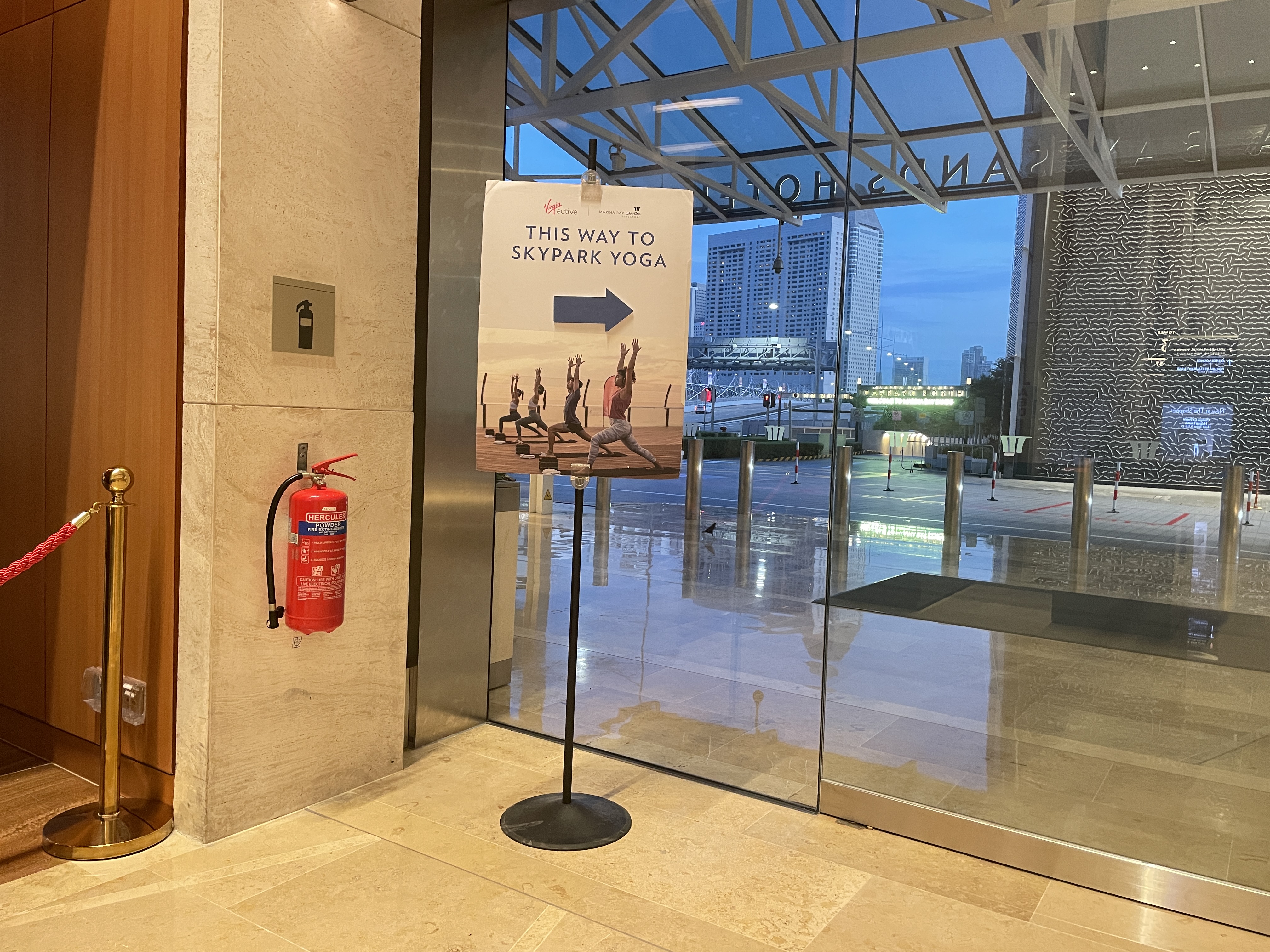 스카이파크 요가는 전망대 개장 전에 입장하는 프로그램이기 때문에 별도의 확인 절차를 통해 입장하게 되며, 너무 일찍 도착하면 이 표지판 앞에서 좀 기다리자. 잠시 후면 요가 예약자를 부르는 안내원이 와서 아까 잠겨있던 유리 문을 열어준다. 지하로 내려가는 에스컬레이터를 통해 57층으로 입장하게 된다. 그러니 지각은 하지 말자. 입장 자체가 어려울 수 있다.