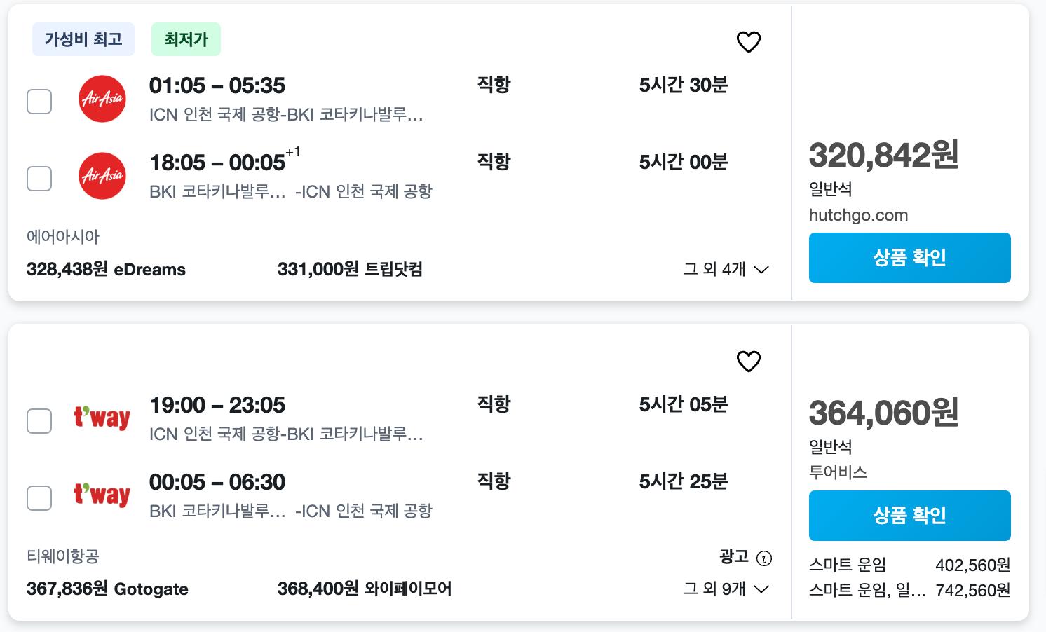 2024년 들어 에어아시아가 코타 키나발루 신규 취항을 하면서, 올 상반기 코타 키나발루로 향하는 항공권 가격이 안정되거나 떨어지게 됐다. 안그래도 인기였는데, 항공권까지 저렴해졌으니 안 갈 이유가 없는 셈이다. 일단 항공권 가격은 요새 호텔스컴바인이 진짜 신박하게 잘 찾아준다.