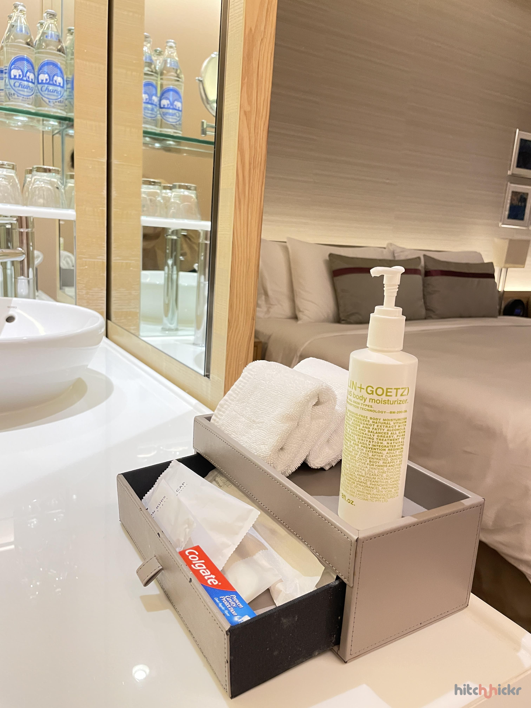 요새 추세에 맞게 페트병이 아니라 유리병에 담긴 창 생수와 욕실 어메니티가 갖춰져 있다. 태국의 많은 호텔이 더이상 페트병을 제공하지 않기 때문에, 방콕이나 치앙마이 여행을 올 때는 물이 새지 않는 텀블러를 준비해 와서 생수를 휴대하거나 전날 사용한 페트병을 잘 씻어서 재사용하면 좋을 것 같다. 유리병은 너무 휴대하기에 무거워서 불편하다.