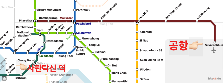 위 노선도가 현재 시점에서 가장 최신 노선도다. 가장 우측이 수완나품 공항 역이고, 가장 좌측 하단이 사판탁신 역이다.