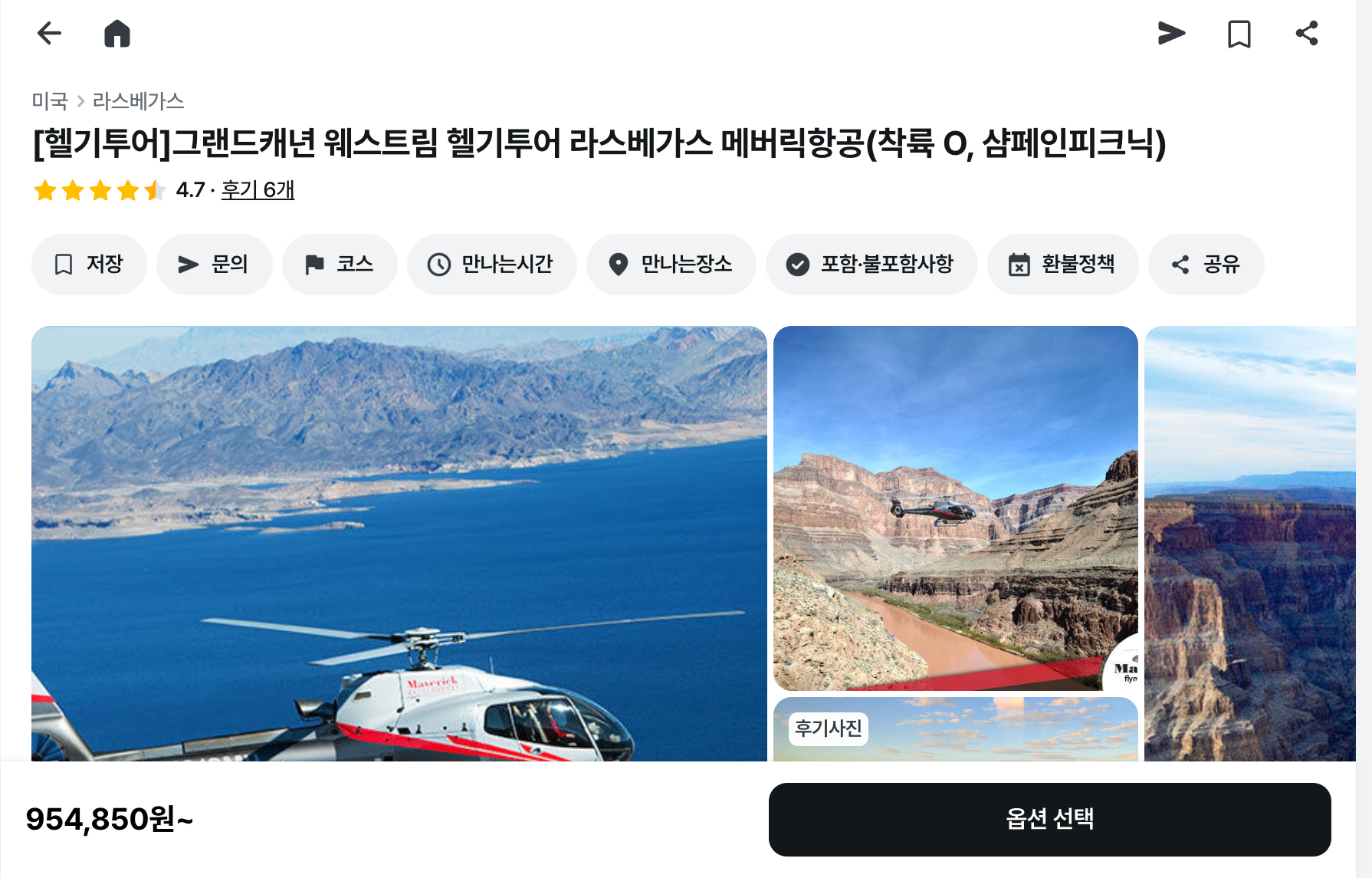 그랜드 캐니언 헬기 투어는 종류가 많아서, 검색해보면 여러 개가 나온다. 그 중에서 레오제이 영상에 등장한 투어는 '매버릭'이 운영하는 투어로, 해당 상품은 여기서 예약할 수 있다. 바로 가기!