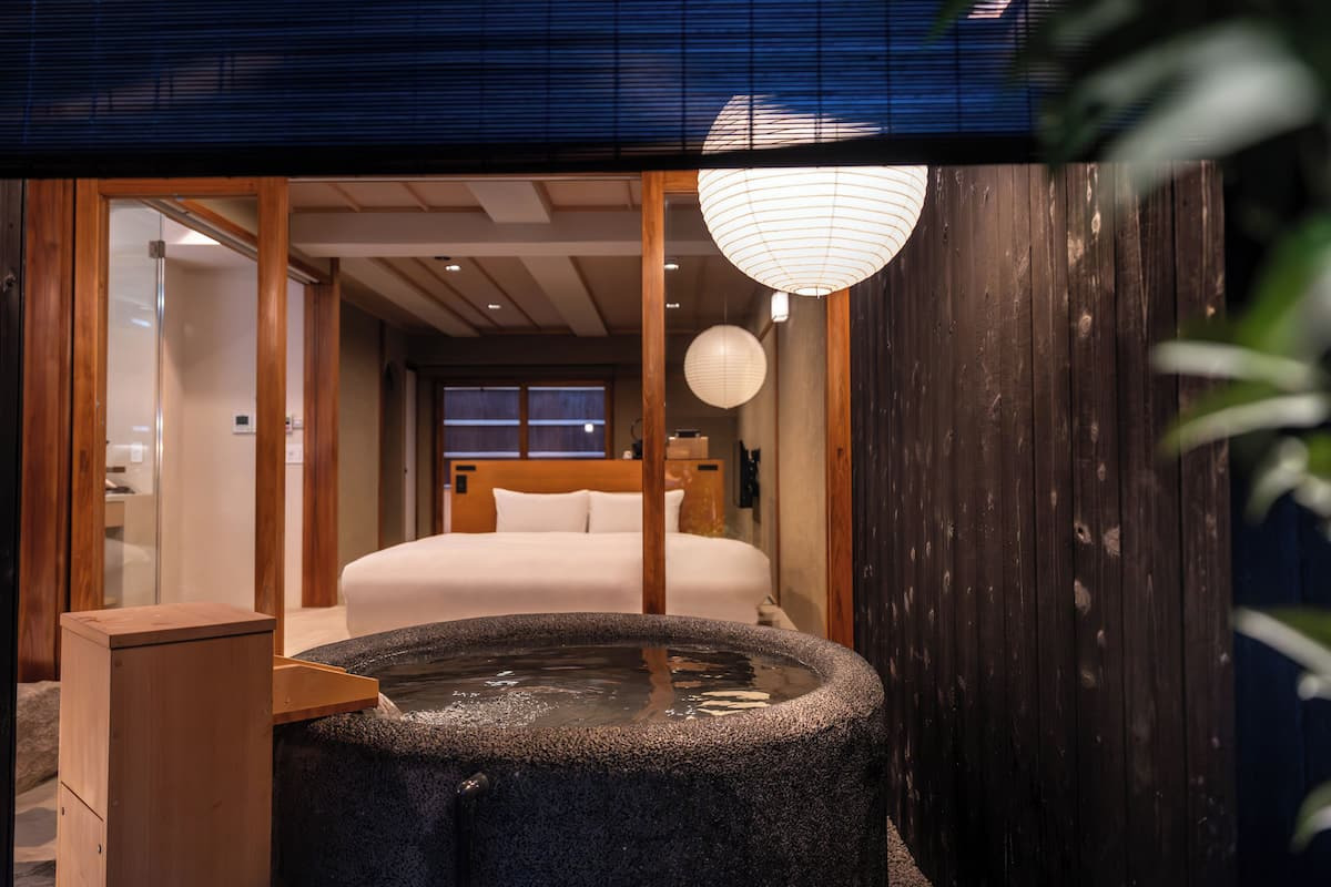 일부 객실에는 석정을 조망하는 노천탕이나 반노천탕이 갖춰져 있다. 온천에 몸을 담그며 자연과 조화를 이루는 지복의 시간을 누릴 수 있다. 기타야마 삼나무 바닥 기둥, 교토 전통 종이인 교카라카미의 미닫이, 와시(和紙) 벽과 흙벽 등 전통적인 소재가 빚어내는 운치에 감싸이며, 번잡함에서 해방되는 평온한 시간을 만끽할 수 있다.